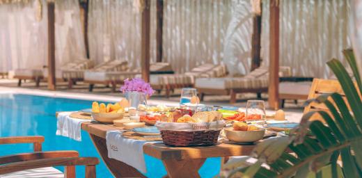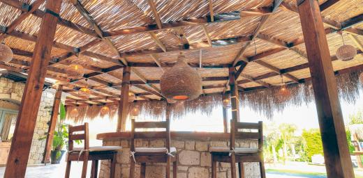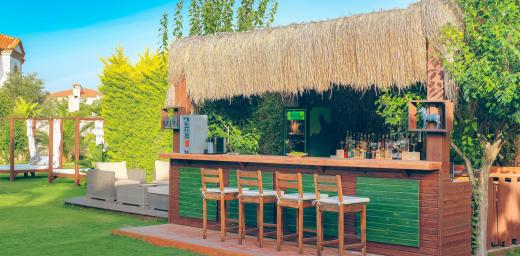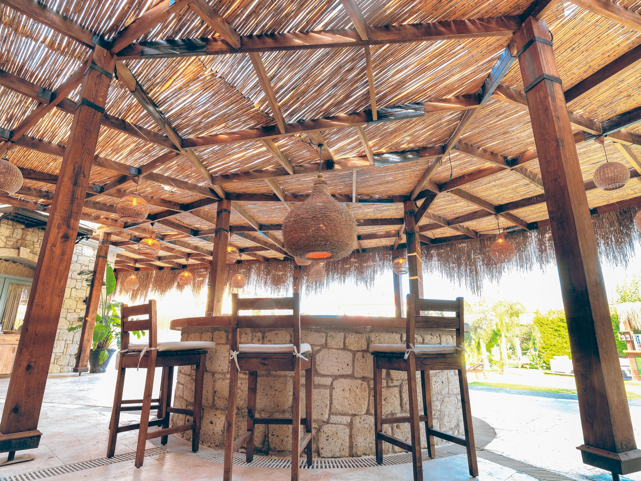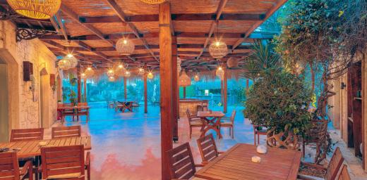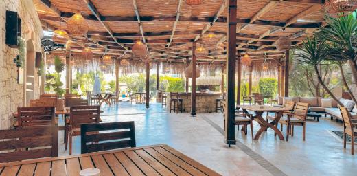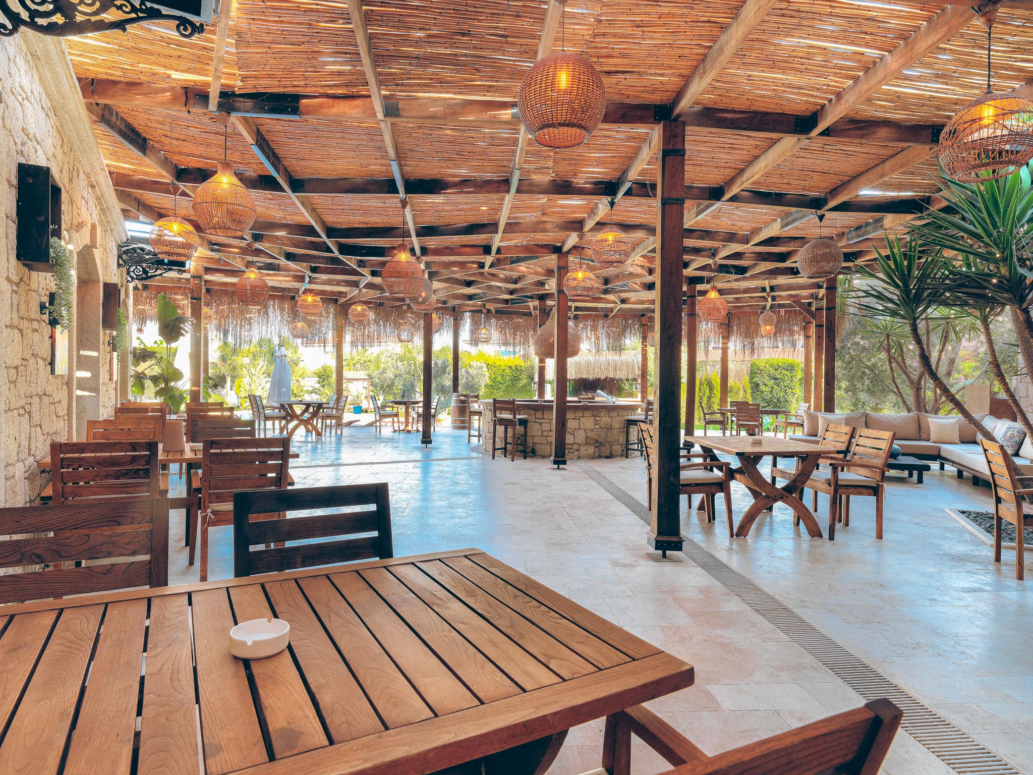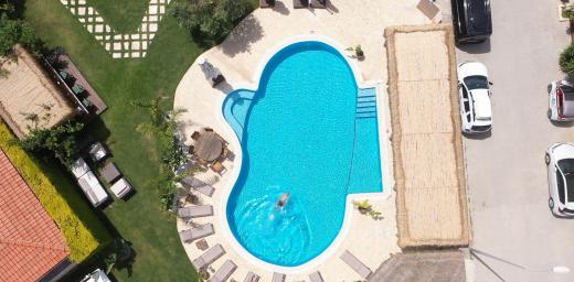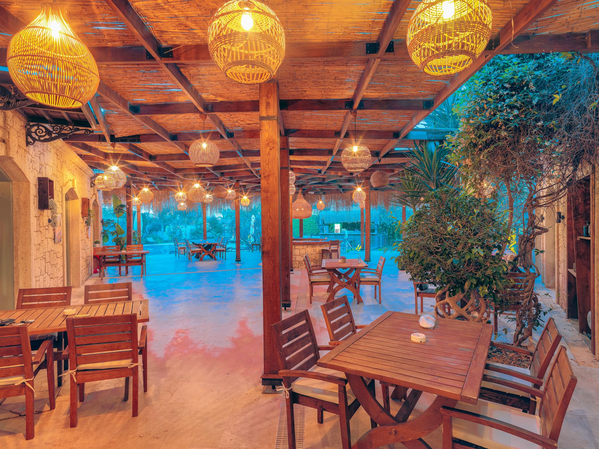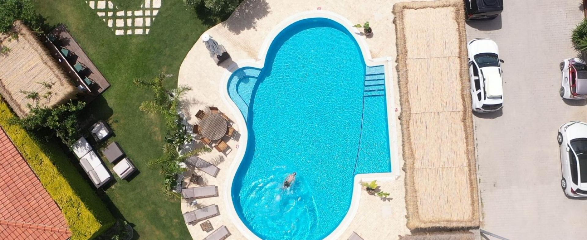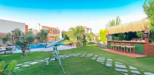Büyük yüzme havuzunun bulunduğu bahçe alanında restoran alanı, bar ve alt yapısı hazır 3 adet bahçe odası yapılabilecek alan mevcuttur.