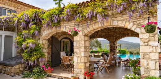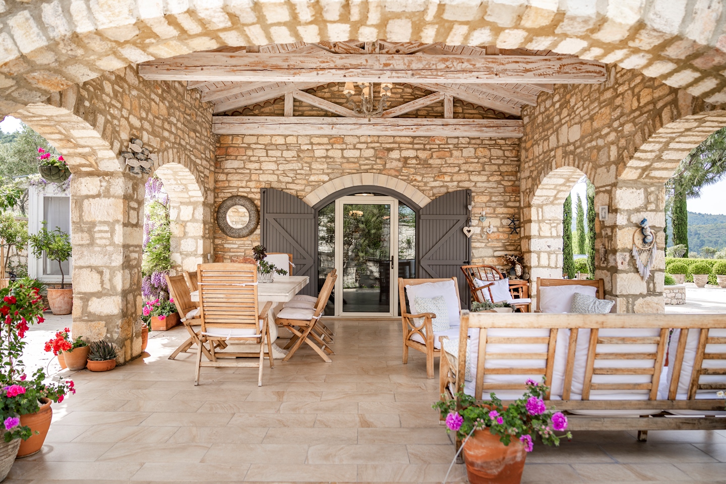 -Provençal taş lavabo ve taş tezgahlı narenciye için iç avlu Tik zemin kaplamalı 15 metre infinity havuzu
